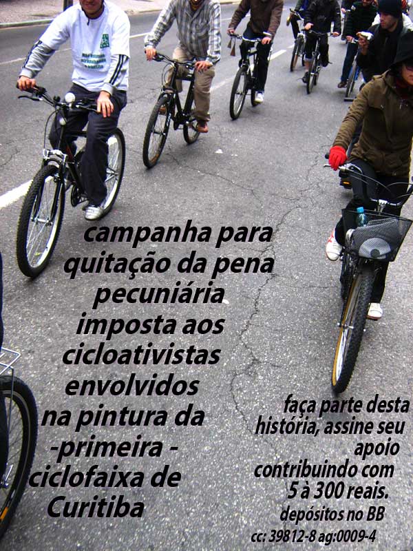 As contribuições para quitar a multa da ciclofaixa de Curitiba podem ser feitas pessoalmente no Govardhana Yogashala (Rua Augusto Stresser, 207) no horário comercial, ou através de depósito bancário (Banco do Brasil – CC. 39812-8 / Ag. 0009-4).
